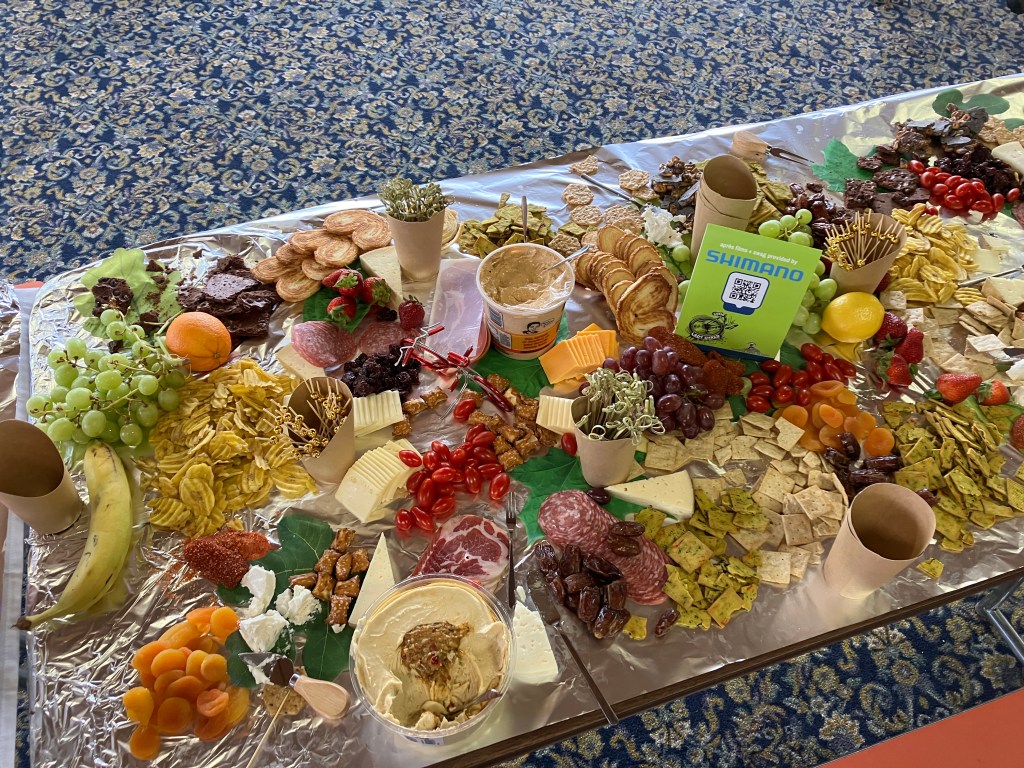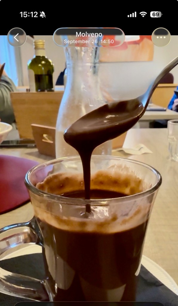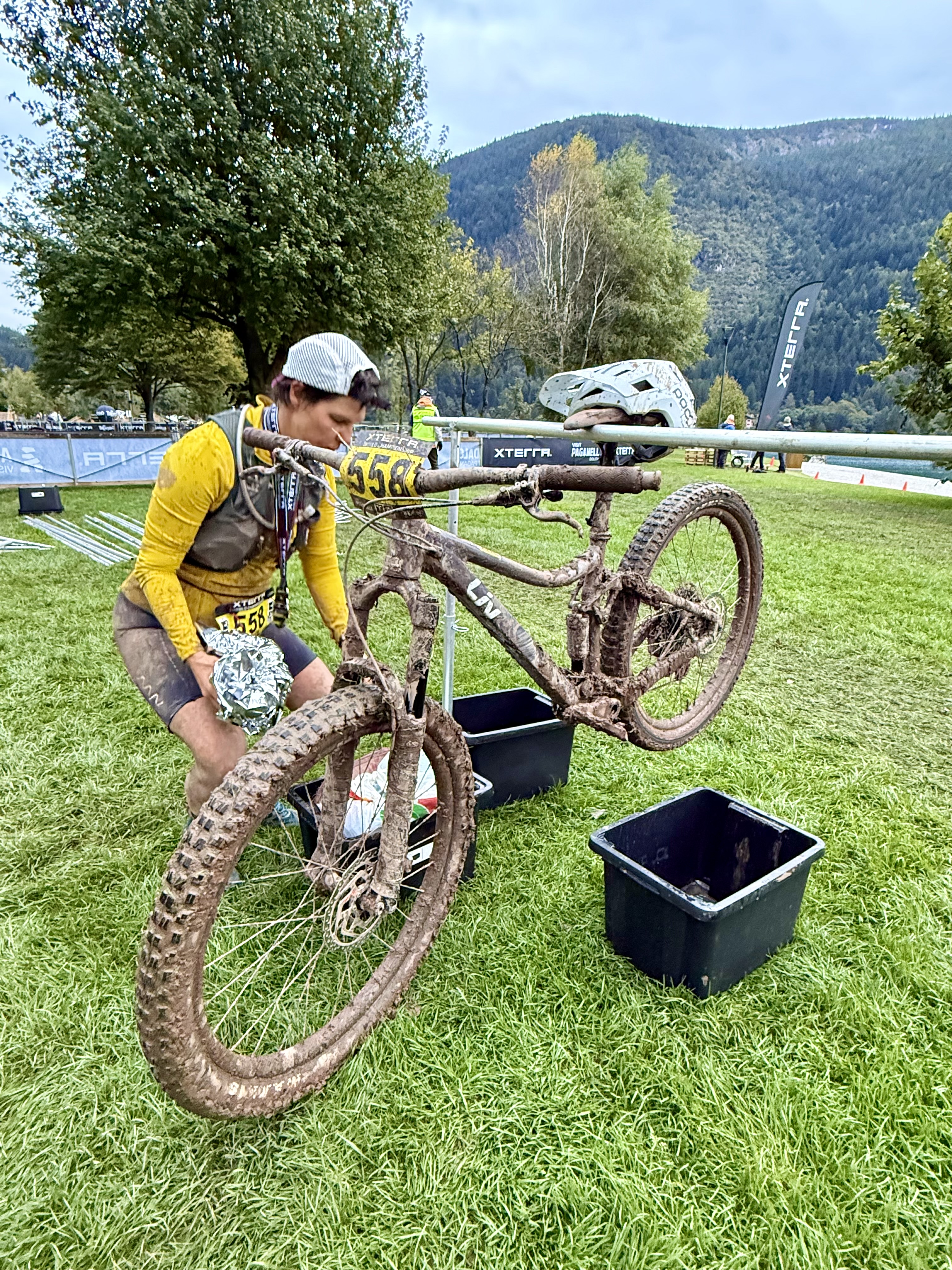 After my little hike, I took the gondola back down to the village and met up with Vanessa at our hotel. The weather was pretty rainy, which resulted in SO MUCH MUD. Vanessa was so muddy that she showered while wearing all of her biking clothes and gear, helmet included. This does not bode well for the race tomorrow….When V was all cleaned up, we met up with Alex for some absolutely amazing hot chocolate and pastries, then wandered around the race site to get oriented. Surprise of the day was our very nice hotel manager who offered to do our laundry! I asked her if there were any laundry facilities onsite and she said no….but she would do it for us. Wow! **Because of that experience, I learned how to say “thank you for doing my laundry” in Italian, which is a super random phrase to learn, but there you go (and now you know what the title of this blog post means!). Another fun fact: breakfast was included in our hotel stay and it was quite the spread (see video below). Much better than the “free breakfasts” provided at American hotel chains!