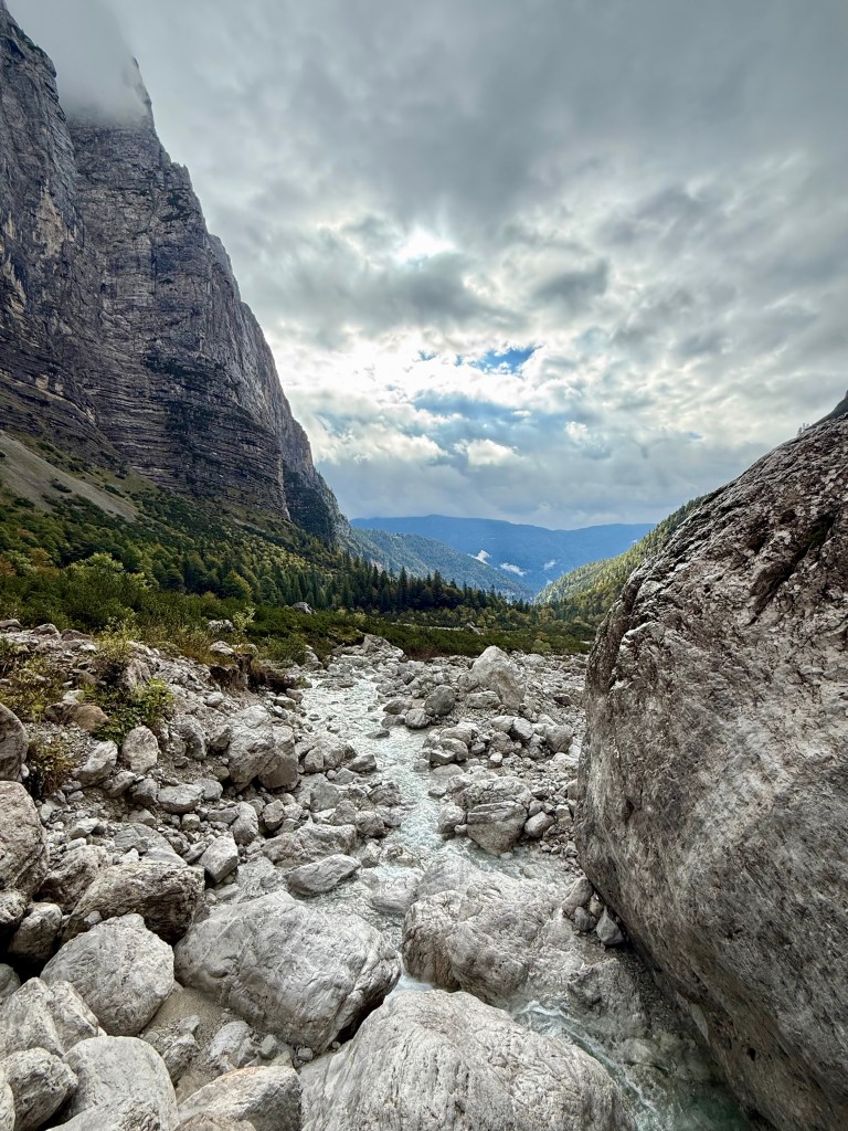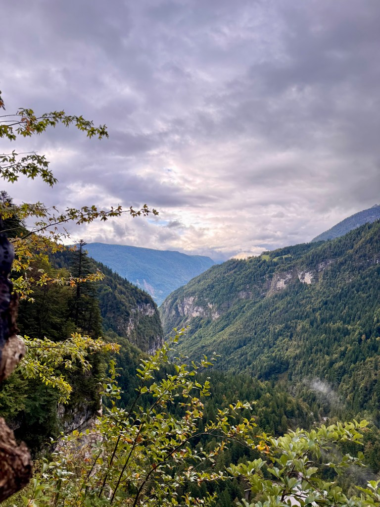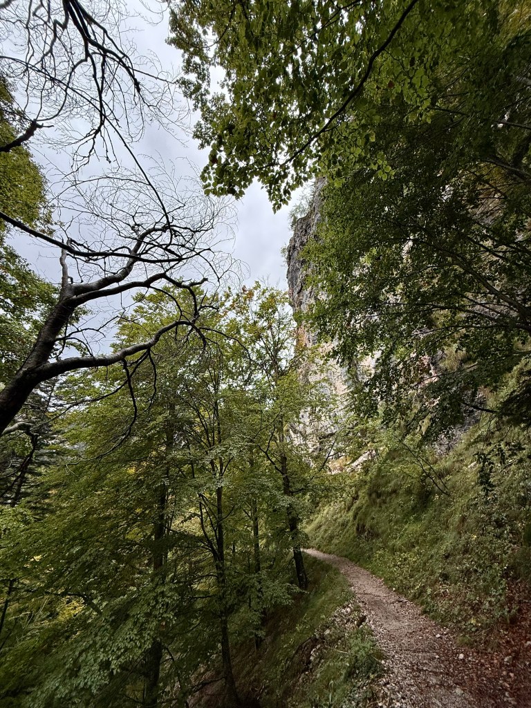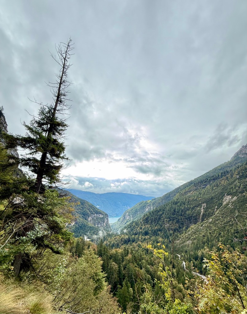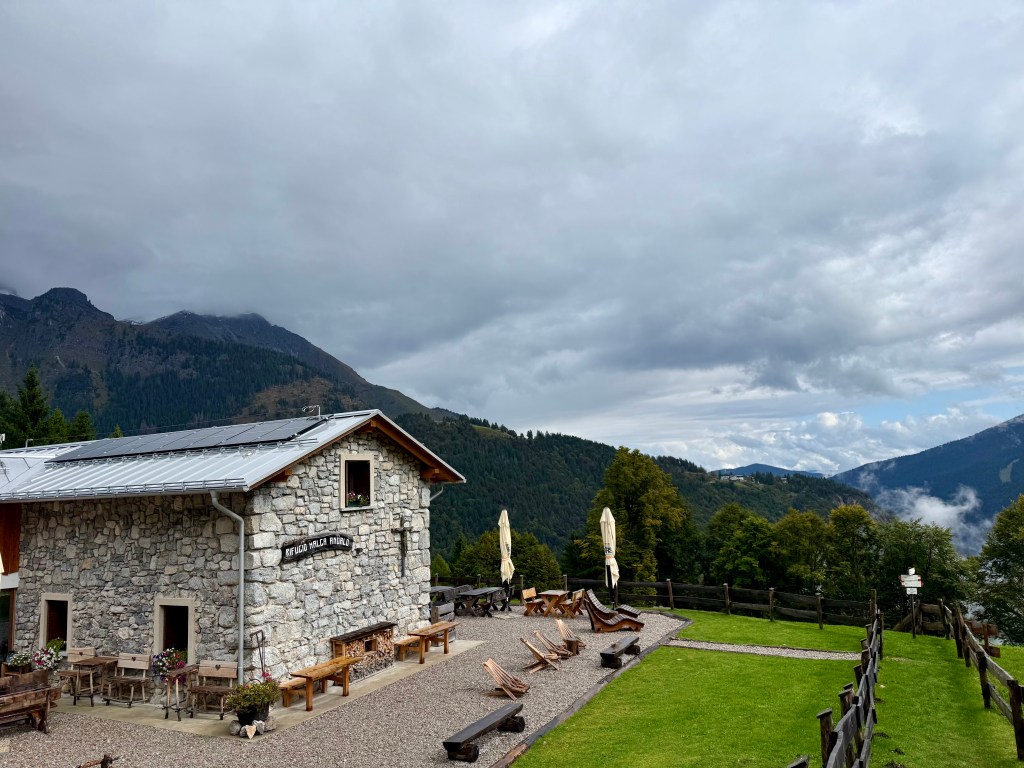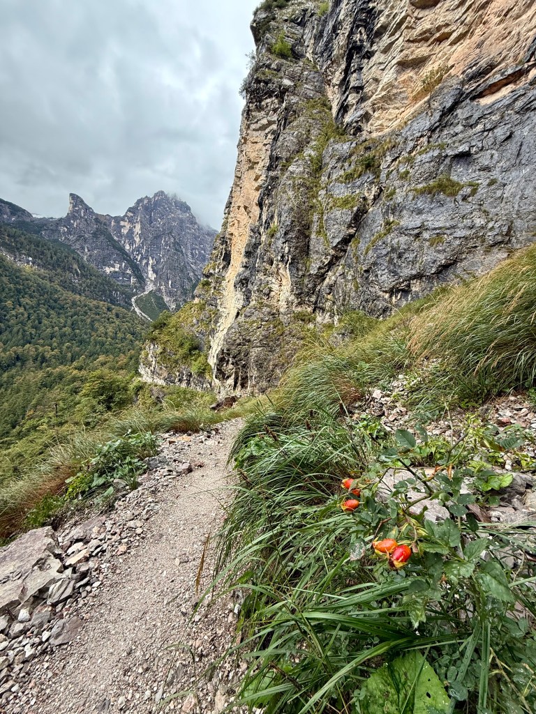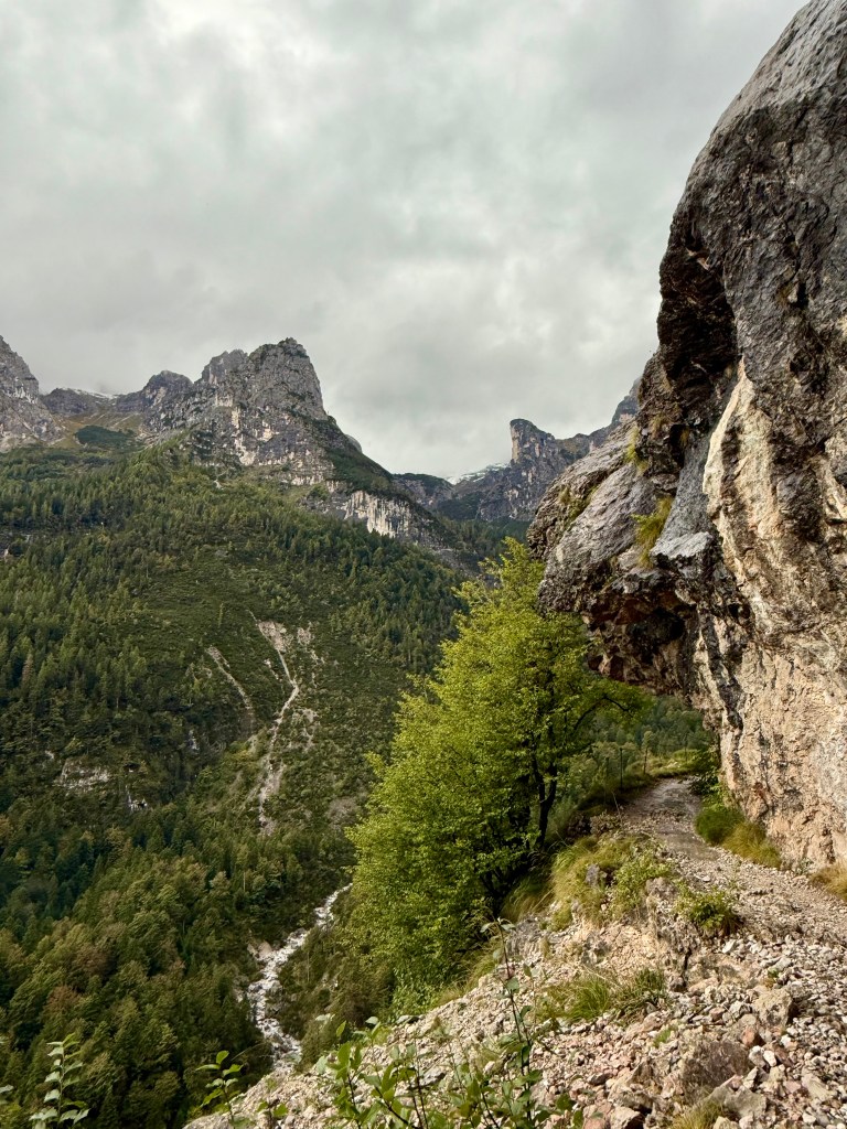 Race day! Which means hike day for me, haha. Like yesterday, I took the Molveno gondola to the top and then started hiking the “3 Rifugio” hike. It was raining for most of the hike, but that didn’t deter me! I brought an umbrella and wore a rainjacket, so was prepared. The hike was super pretty and a little slippery in some parts. There was even a short “via ferrata” (Italian for “iron path”) section that featured a steel handrail bolted to the rock wall. That handrail is to provide some support along the exposed part of the trail. I can’t say enough about how beautiful the hike was, so I’ll let the pictures speak for themselves.