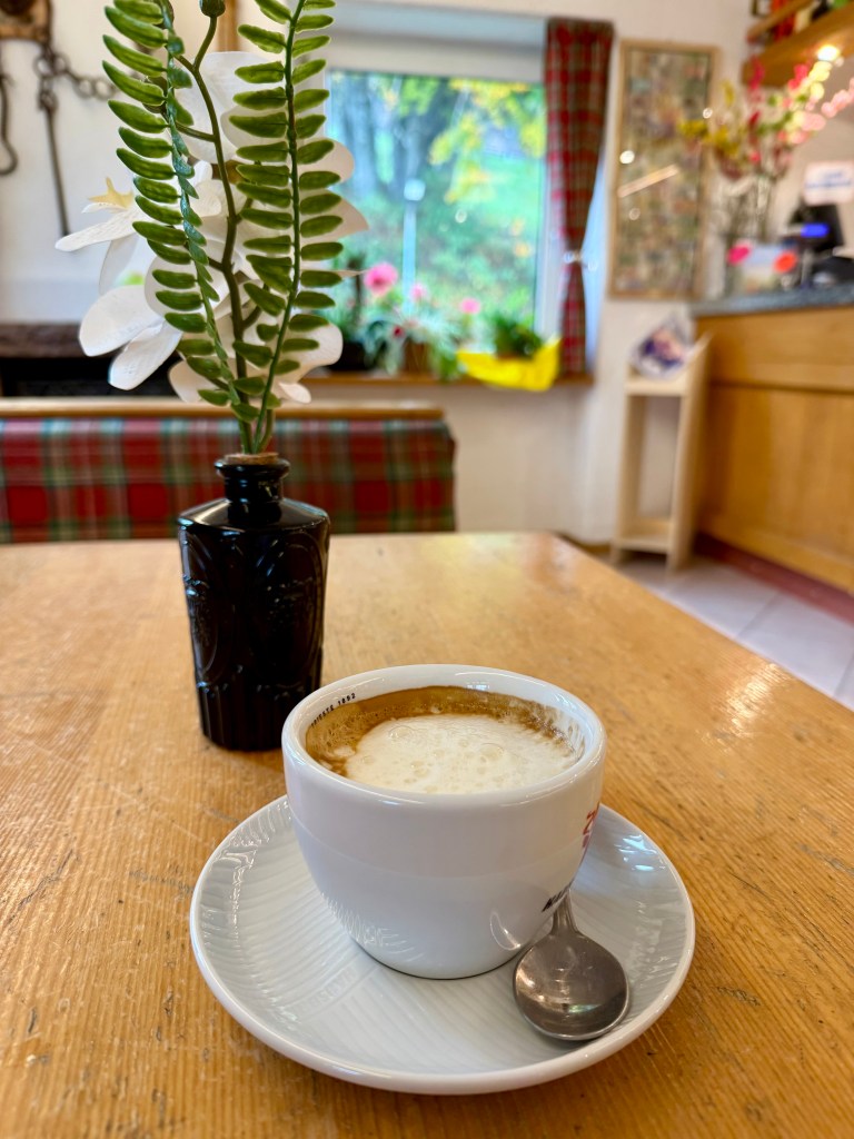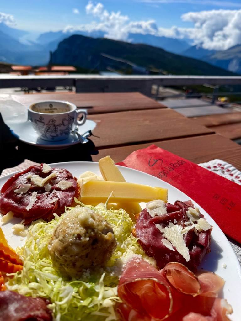Today was the day before the big race, so Vanessa decided to pre-ride the bike course. While she did that, I took the Molveno gondola to the top and did a short hike. I planned on doing a bigger hike tomorrow that started at the top of the gondola and thought doing some reconnaissance work would be a good idea. One of the cool things I learned while in Italy is that many alpine trails feature “rifugios,” i.e., mountain huts that offered food and (sometimes) accommodation). Essentially, these huts were little cafes and were found every few miles or so. This is great because instead of packing a ton of food on your hike, you could plan to eat a meal at a hut! There was one such rifugio at the top of the gondola and I treated myself to a cappuccino (my first “rifugio” coffee!).