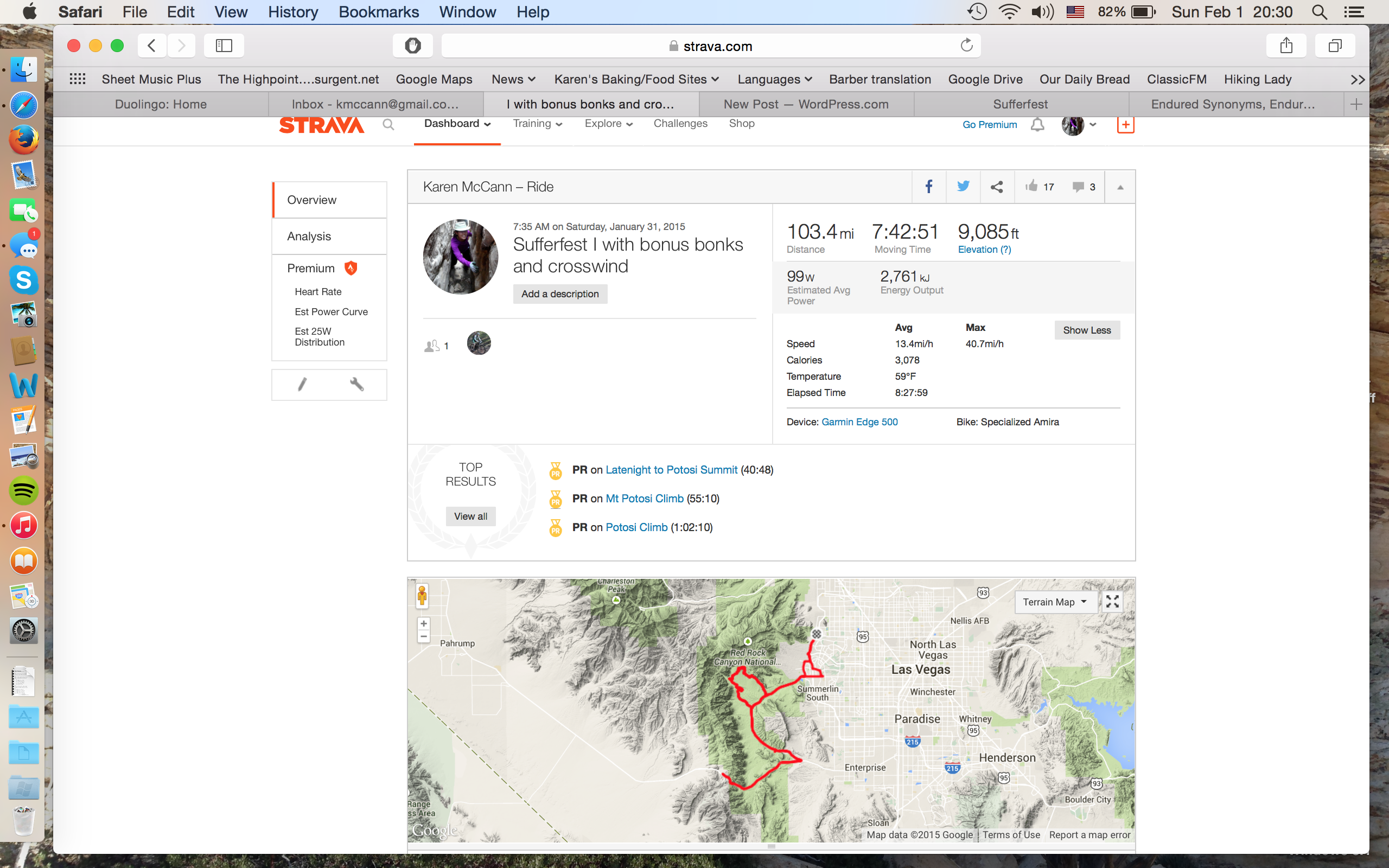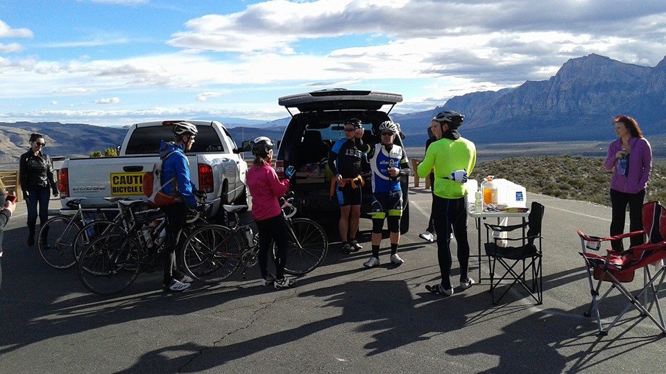 The title of this blog post does not refer to each and every single bike ride I endure. It refers to the local “fun” event held yesterday by a very generous businessman/avid cyclist. Over the past 10 years, he has sponsored 3 long and painful rides each year, appropriately named Sufferfest I, II, or III. Each year, the Sufferfest I ride (what I braved yesterday) consists of 2 Red Rock Canyon scenic loops, 1 climb up Potosi, then back to the Red Rock loop for a third torturous circuit. Anyone who has ever cycled the Red Rock loop knows that the first 5 miles = pure climbing; it is a 13.1 mile one-way road that begins with a 1000 foot climb….then retreats a little bit, then ascends again, topping out just before mile 5, after which the road descends and cyclists joyfully ride downhill….then at mile 7, you hit a “wall,” which basically feels like you’ve run into a brick wall. After that, though, it’s pretty much downhill to the end. Imagine doing that loop once. Now imagine doing that twice in a row. Then you ride up to the Potosi summit, which is a 9.5 mile ascent that gains just over 2200 feet in elevation. Yuck. Then you zip back down to do ANOTHER RR loop. Then you collapse.