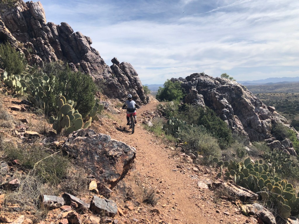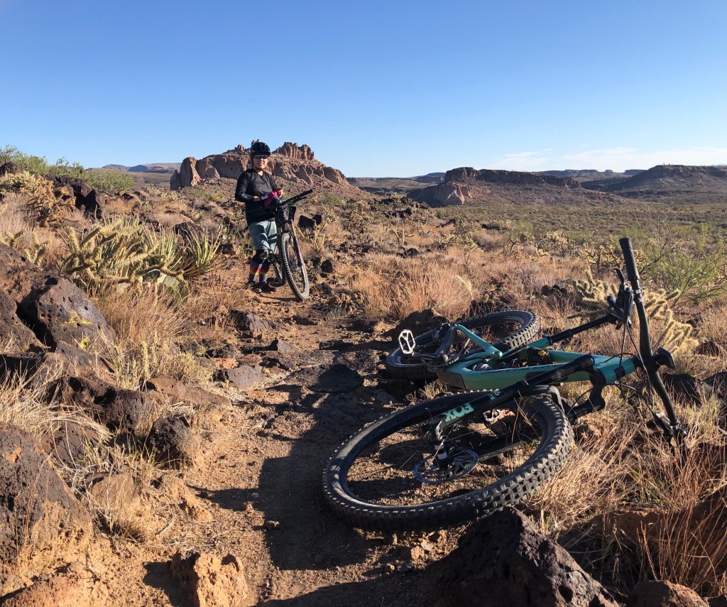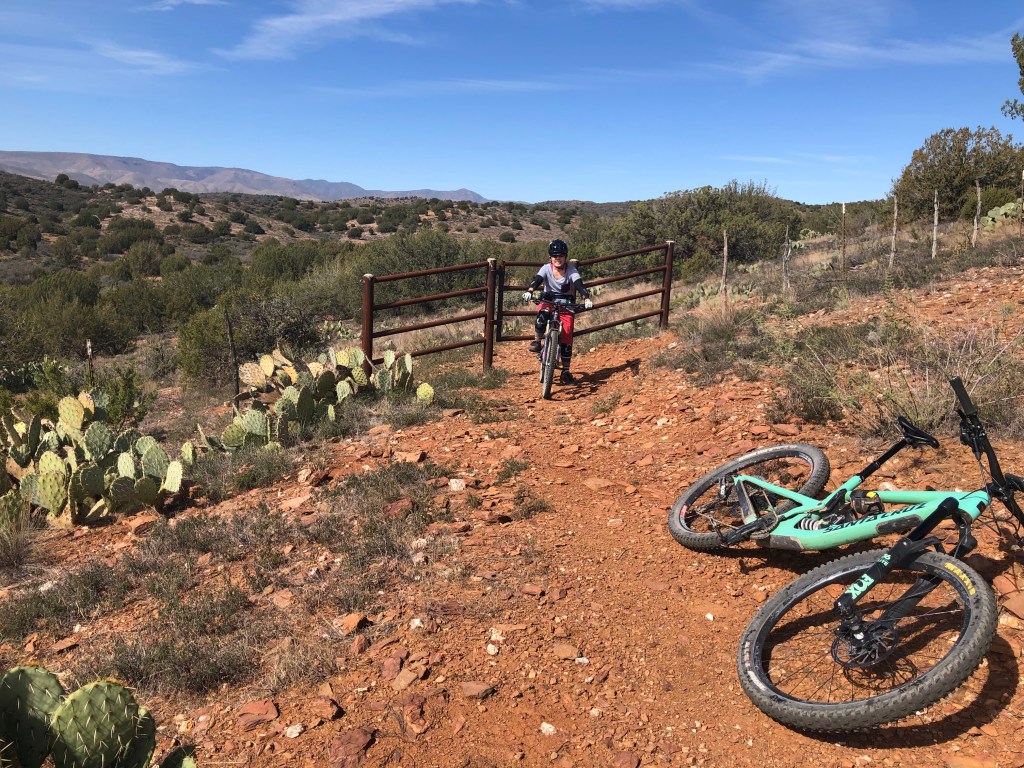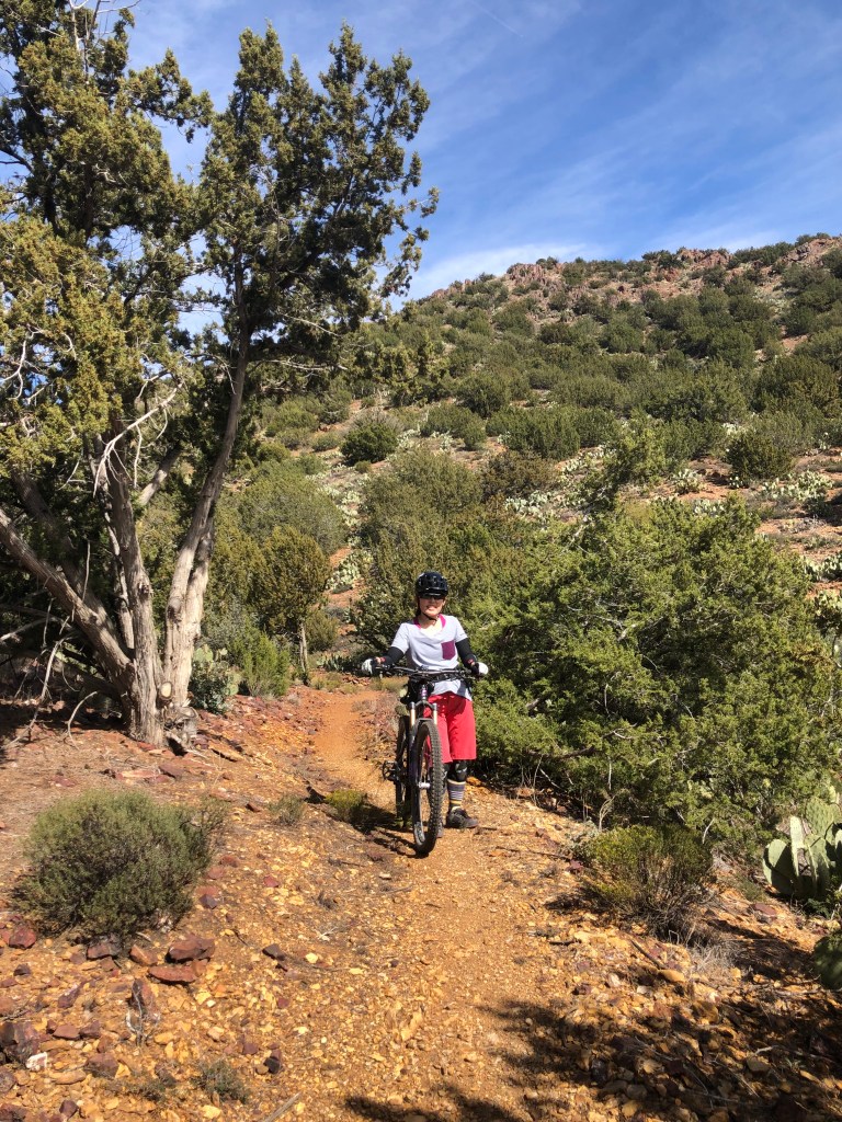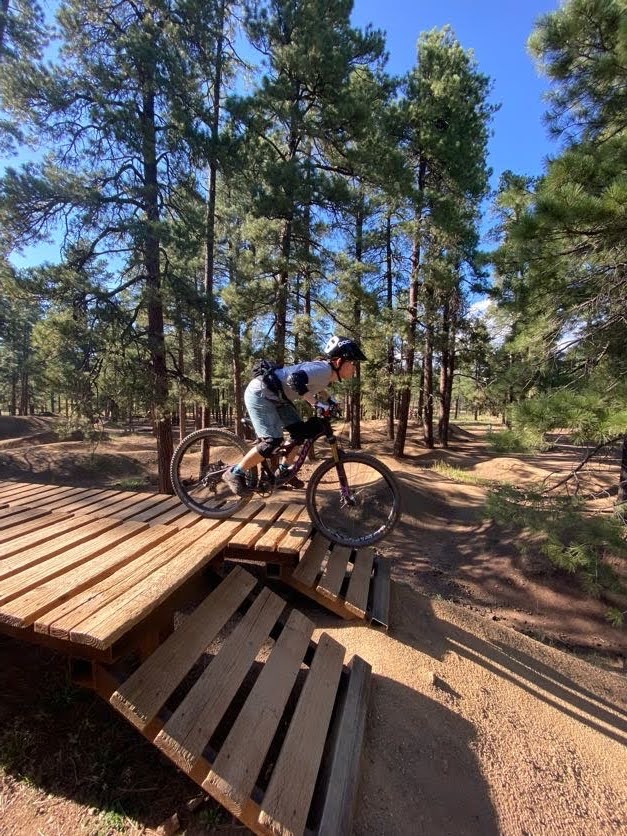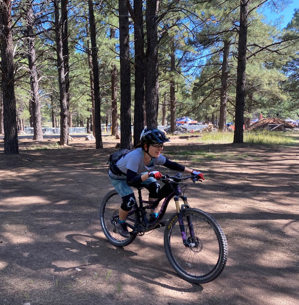 First, in September, I got to participate in a SMBA ladies’ bike park skills clinic at the Fort Tuthill Bike Park just outside of Flagstaff. A bike park is a specially designed place where you can practice mountain biking skills, such as jumping (riding over and past a ramp to “get some air”), dropping (either rolling down or dropping over an obstacle, like large boulders or tree stumps), and pumping (using your arms to create momentum, i.e., pumping, while riding on a closed track). My clinic focused on the mountain bike fundamentals, like cornering and shifting body weight forward and back, then used the fundamental skills to test our abilities on the various bike park features. I’m still a beginner when it comes to doing jumps and drops, but I feel like I now have the head knowledge to attempt baby jumps and drops on my home trails. It was a fun day up in Flagstaff and inspired me to continue working on my skills.
