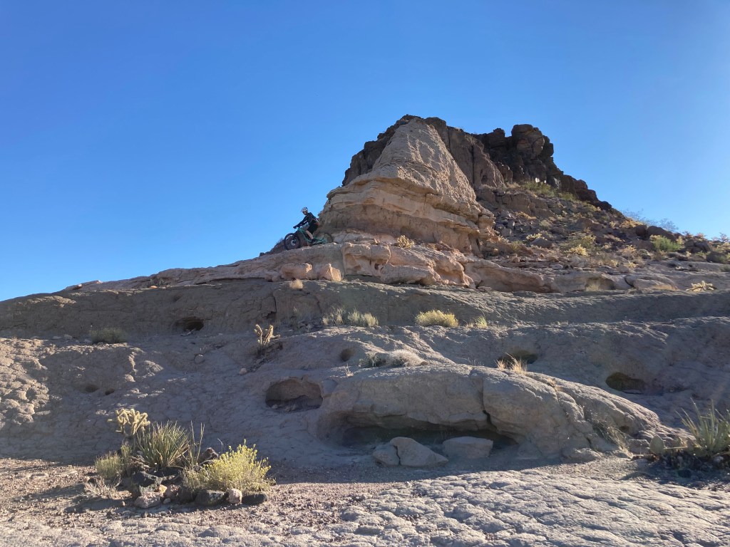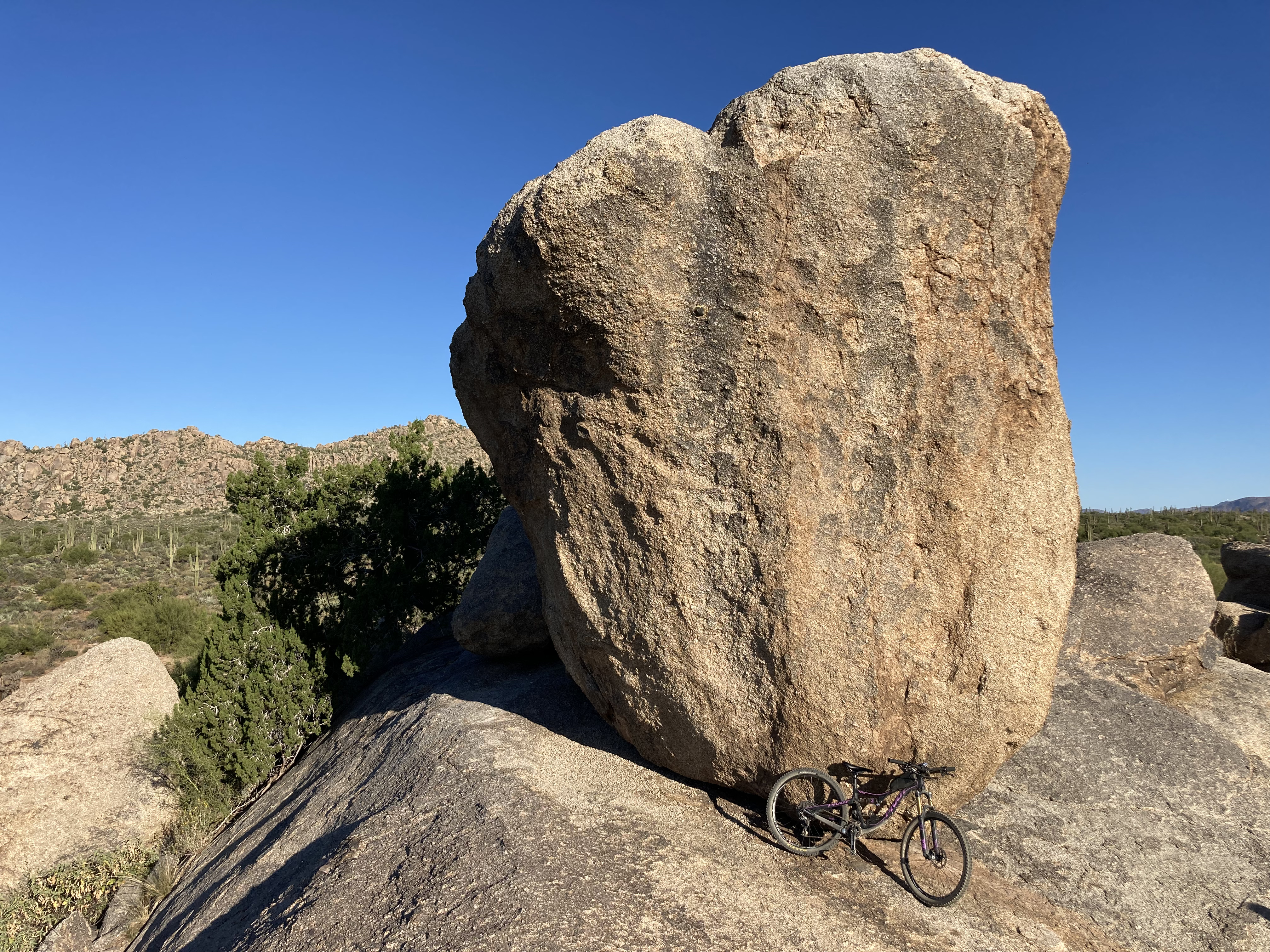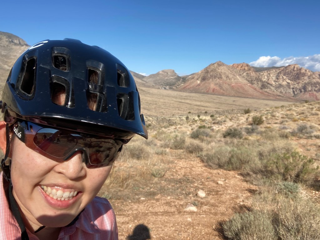 For the October long weekend, my SAT (self-appointed trainer, for you newer blog readers!) and I went to Vegas to visit friends and do some mountain biking. I was particularly interested in seeing how similar/different the Vegas trails are compared to the Phoenix trails. I’d say that the Vegas trails I rode are more rocky and rugged than the Phoenix trails (not that there are no rocks in Phoenix, just that there seemed to be MORE rocks in Vegas). That difference made for a slightly more challenging riding experience for me, but in a good way. I definitely rode some sections that were pushing me out of my comfort zone because of factors such as technical rocky sections, exposure, and the unfamiliarity of the trails. It was really fun to catch up with friends and I know my riding improved because of navigating new trails and practicing “looking ahead” and “reading the line.” During the drive back to Phoenix, my SAT and I stopped at the Monolith Garden trail system just outside of Kingman and checked out the trails there. We really enjoyed the beauty of the rock formations and the solitude of the area (we didn’t see anyone during our entire ride). The rock formations reminded us of the Chiricahua National Monument in SE Arizona–simply amazing.