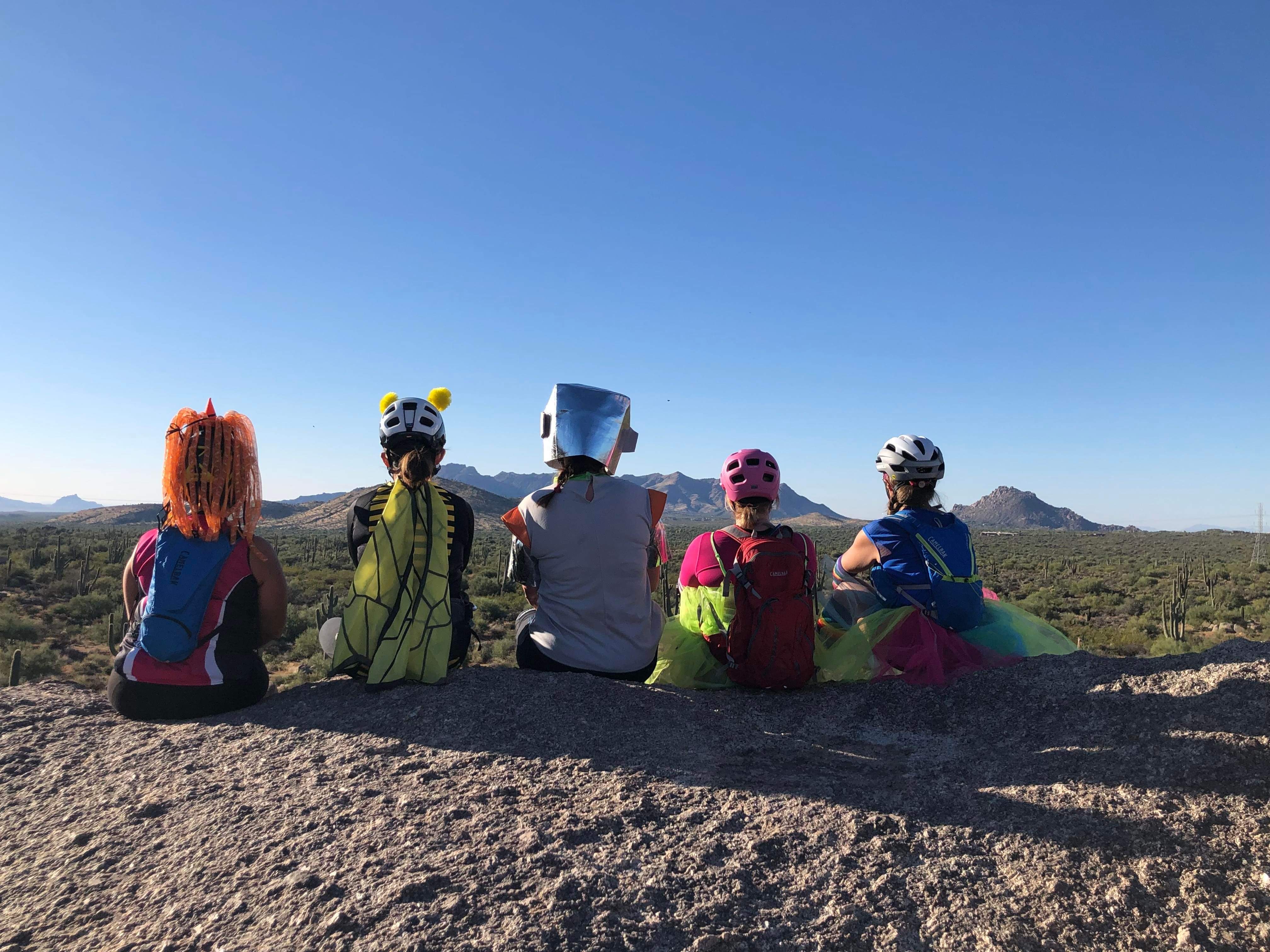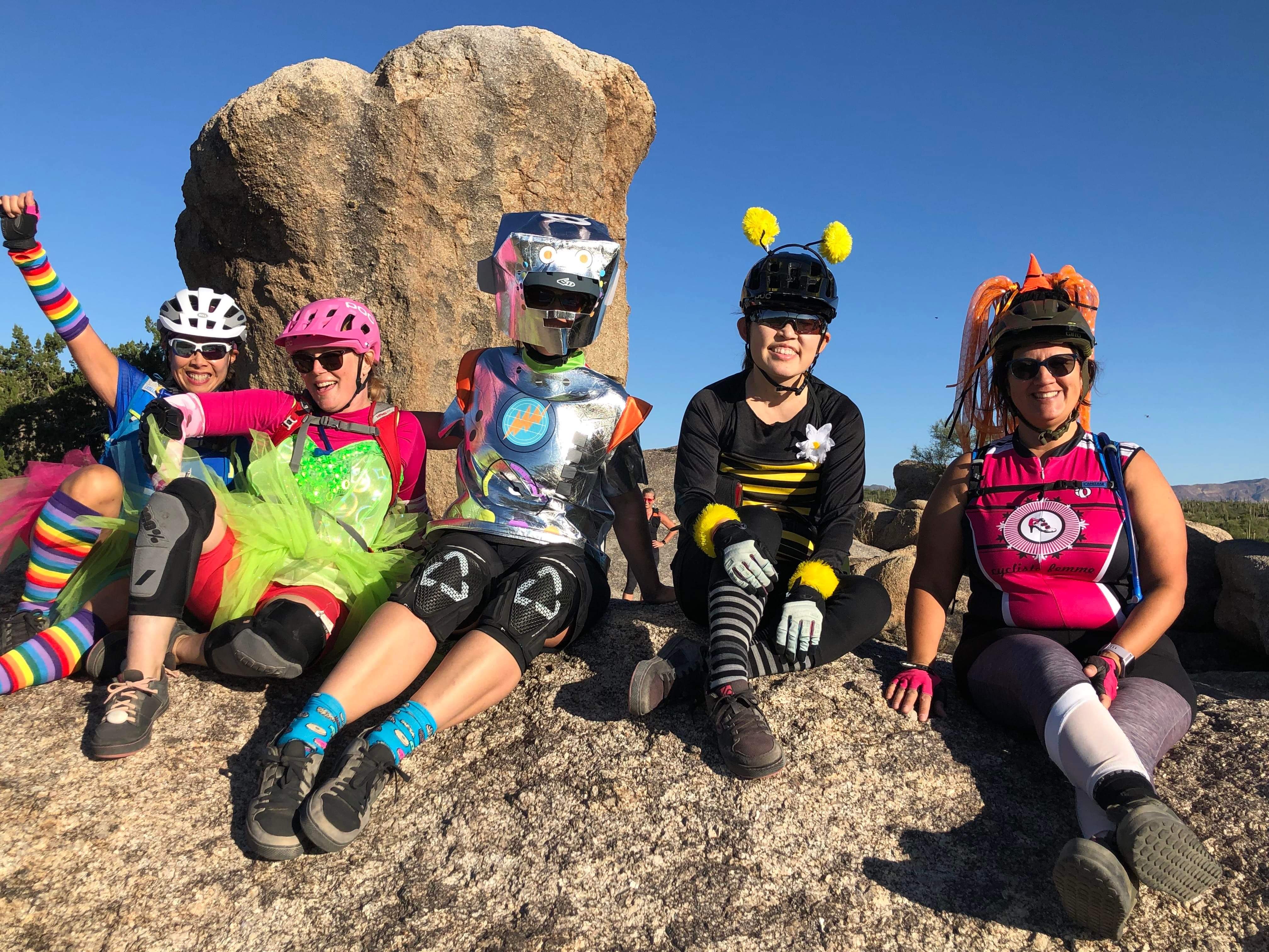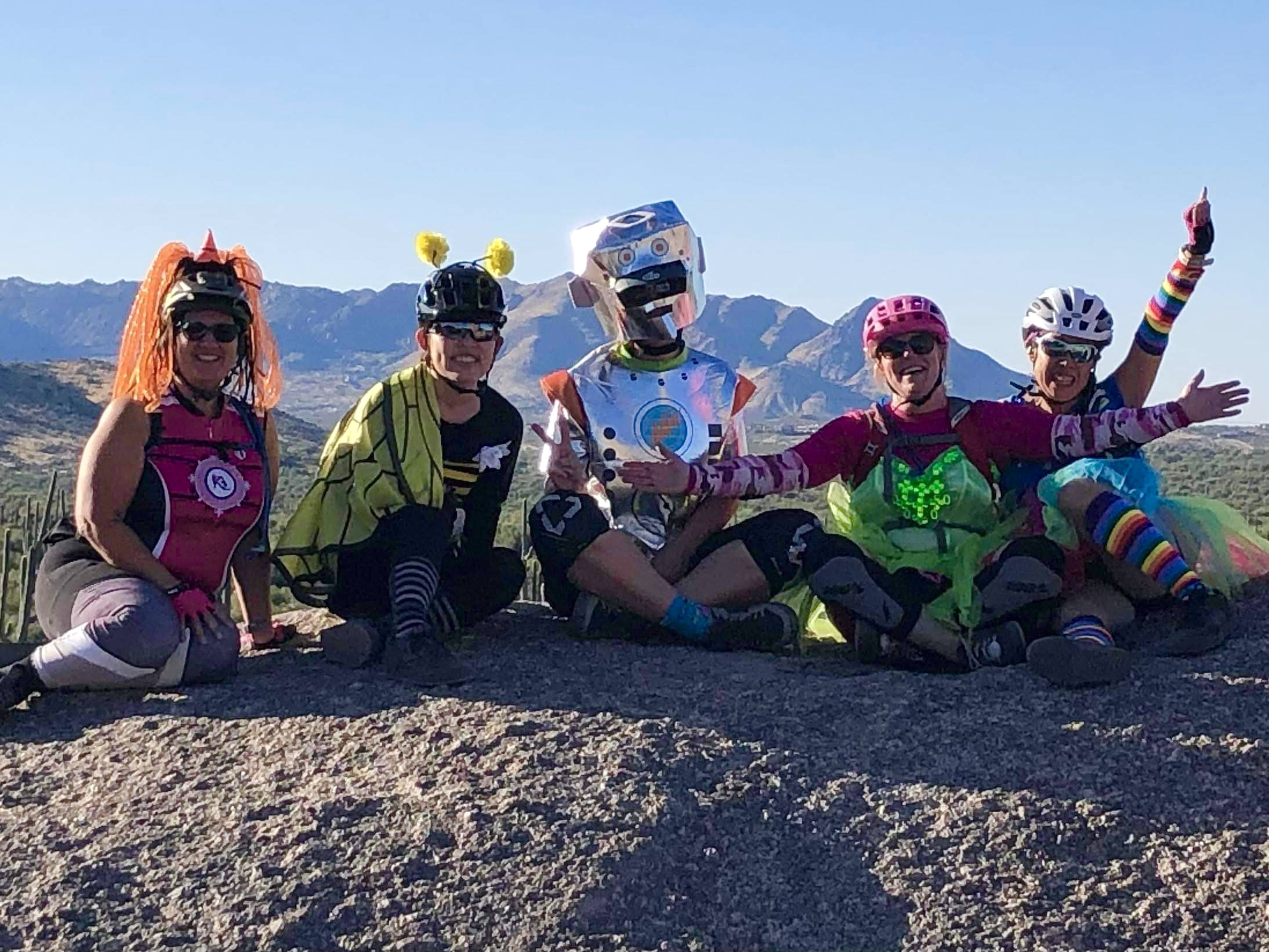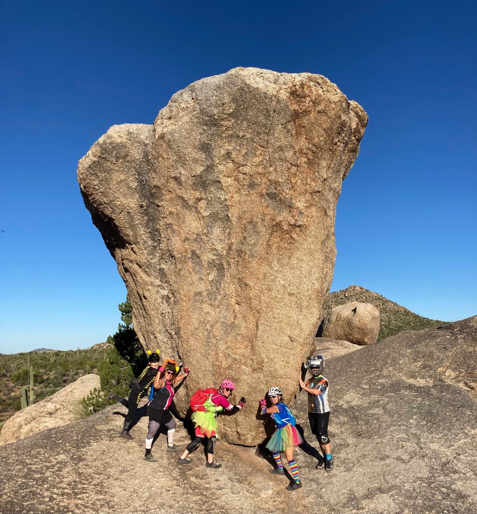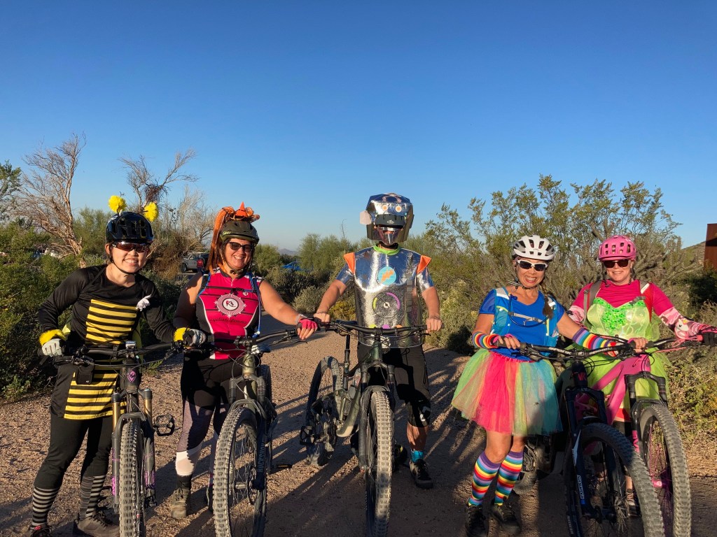 One thing I started doing this fall is lead a weekly ladies’ beginner ride at South Mountain. I’m part of a Phoenix-area ladies’ mountain biking group and was riding so much that the group leaders noticed and asked if I would like to be a ride leader. Of course I said yes! I’ve had a lot of fun meeting new ladies and showing them some things I’ve learned since I started working on my riding skills last year. In addition to my weekly rides, I plan on organizing longer weekend rides every so often. Today, I led a Hallowe’en-themed ride at Browns Ranch and my little group had a great time enjoying the scenery and taking lots of fun photos.