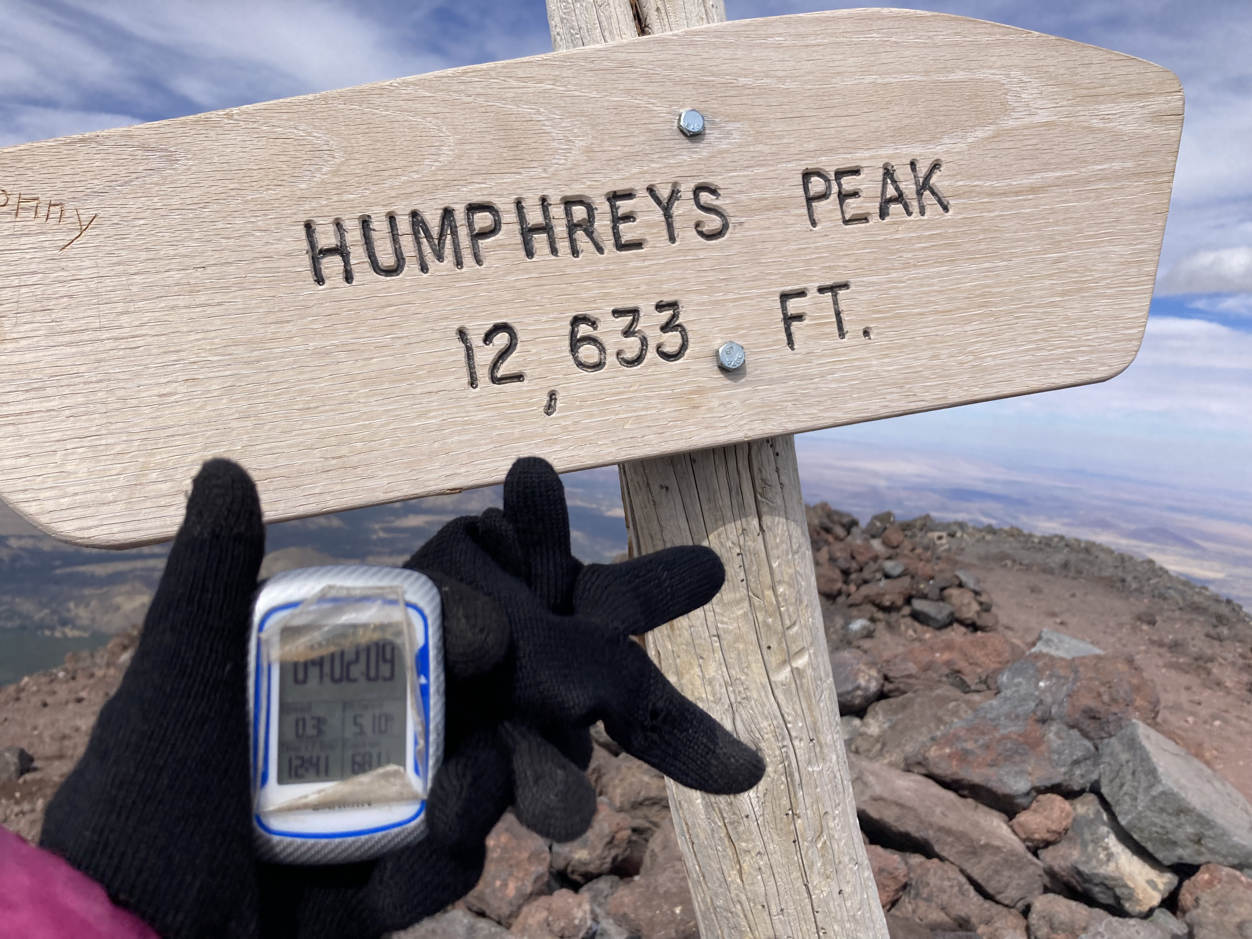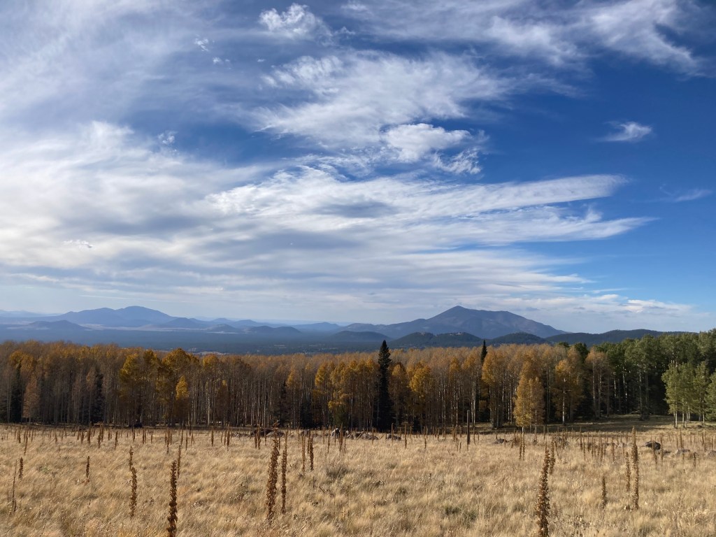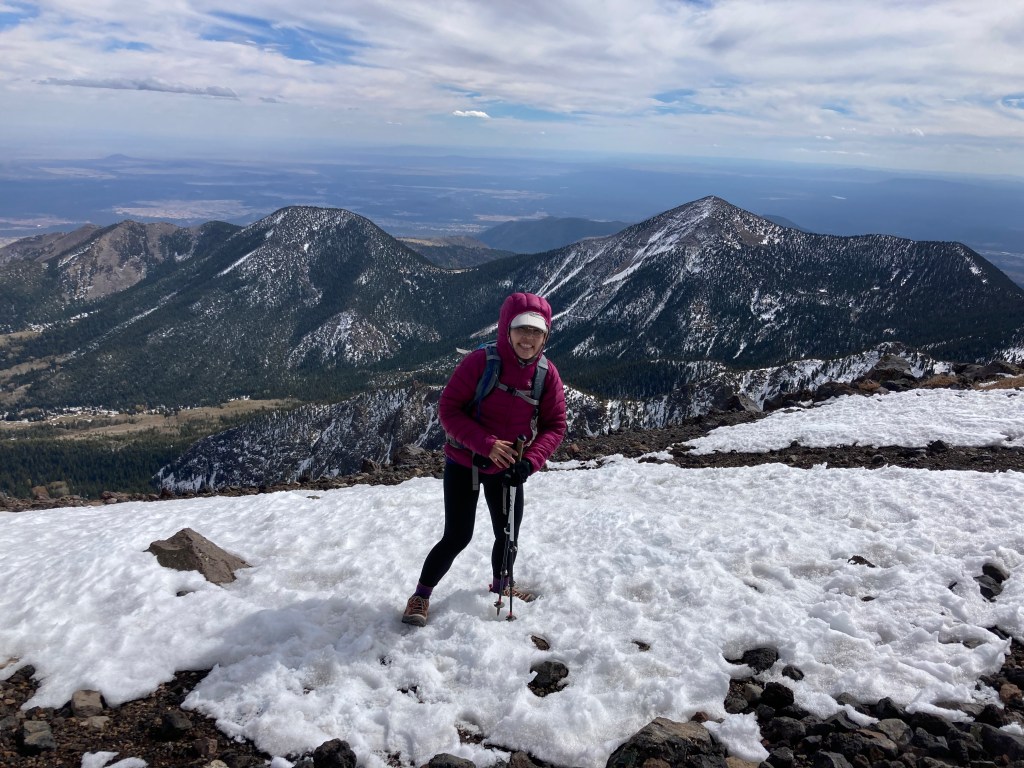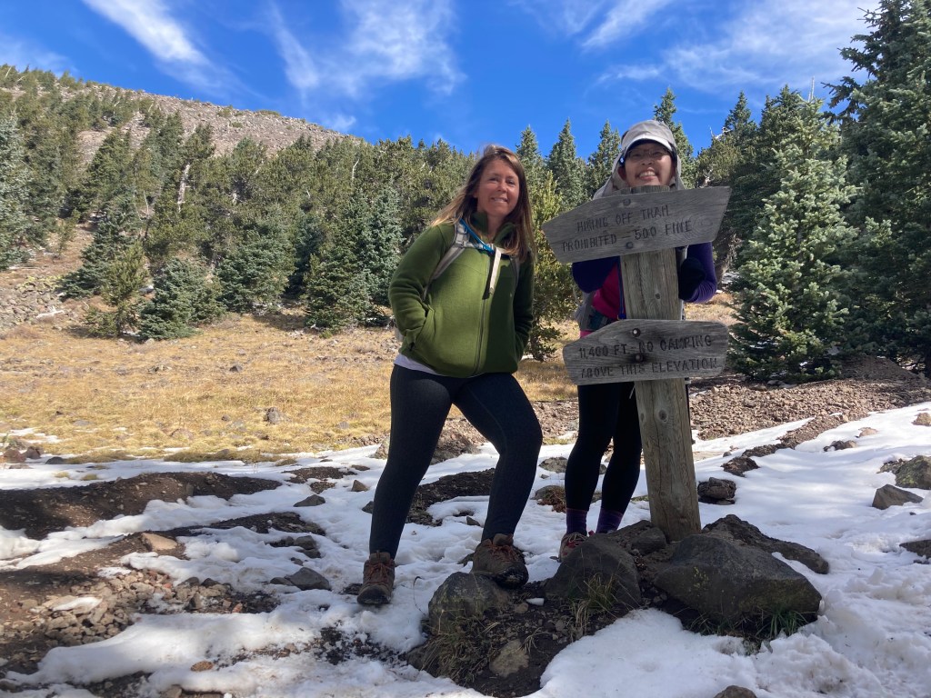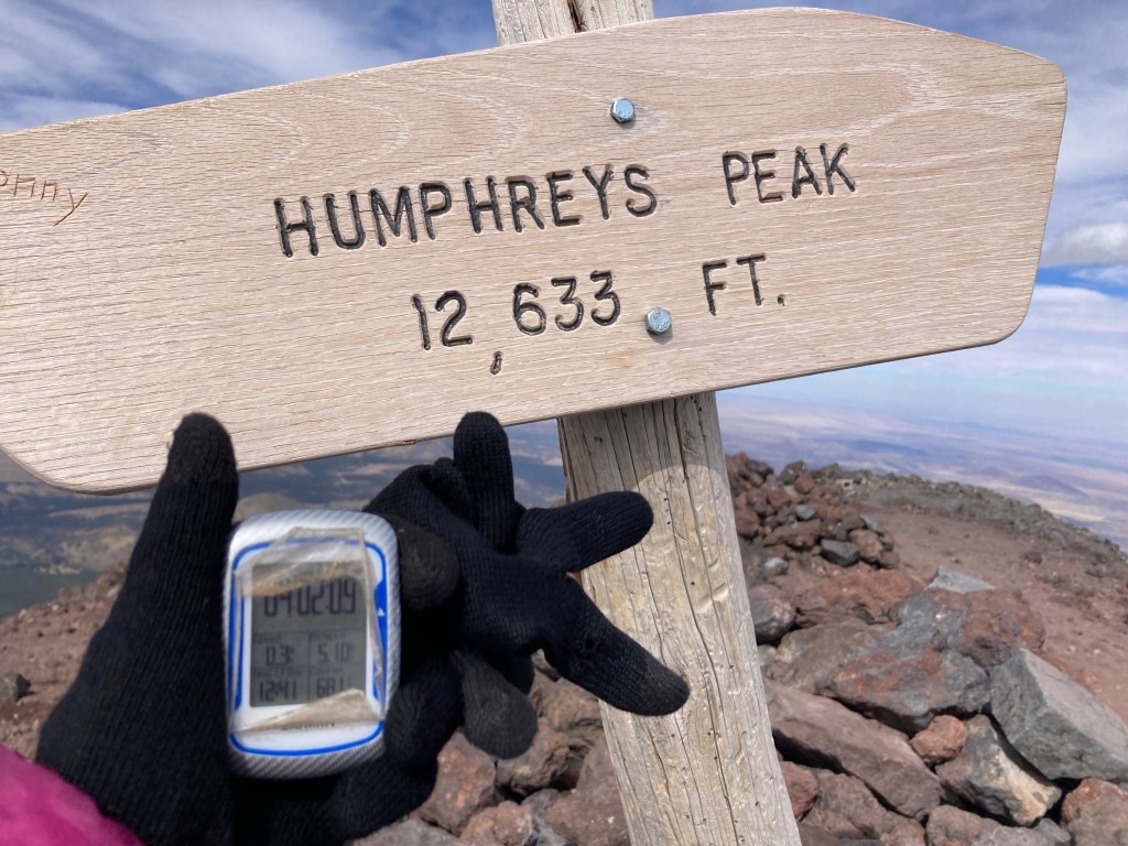 On October 17, my friend Crystal and I successfully summited Humphreys Peak. We do this hike each year, usually in the summer. However, this summer, we could not do the hike because of all the forest fire closures in and around Flagstaff. We were a little bummed to miss out on our annual “do or die” tradition, so when the forest fire closures lifted, we decided to pick a fall date and go for it. [Note: by “do or die,” I mean that we pick a date and hike Humphreys without training for it. We drive up, hike, and drive back in one day.] Our “do or die” approach is not something I recommend because the hike is a pretty strenuous one. Humphreys Peak is the highest point in Arizona, sitting at 12,633 ft (3,851 m), so altitude sickness is a real concern. According to my Garmin (cycling computer that tracks distance, elevation, and other workout statistics), the hike is a total of 10.2 miles round trip. Elevation gain is around 3,500 ft (1,067 m).