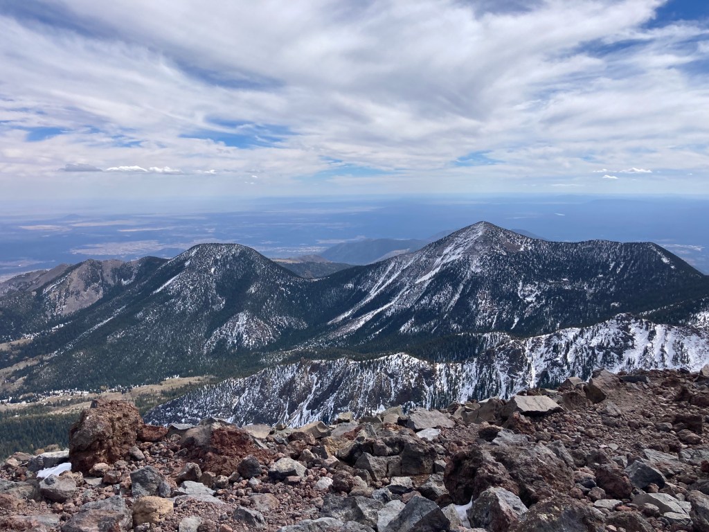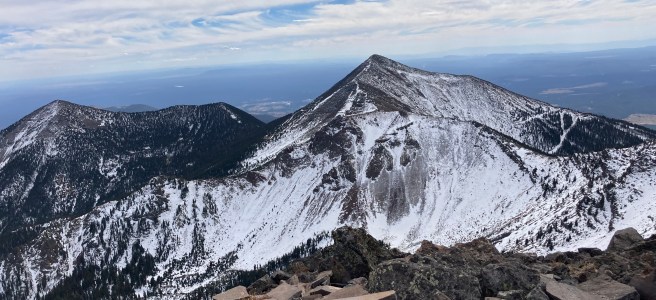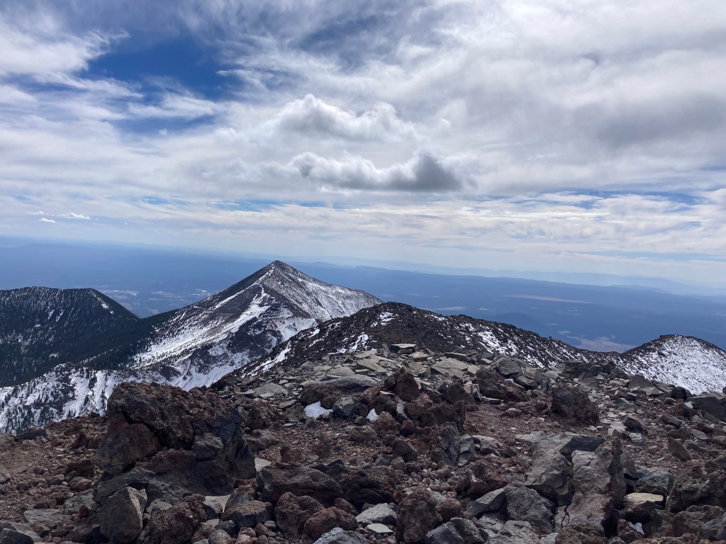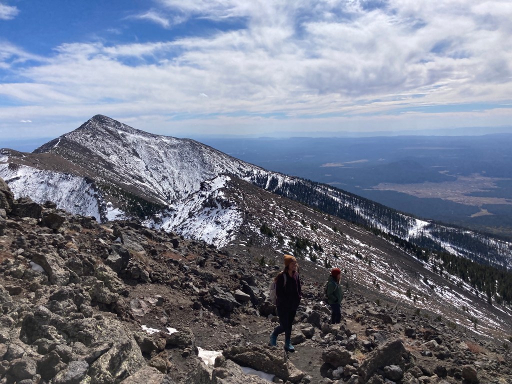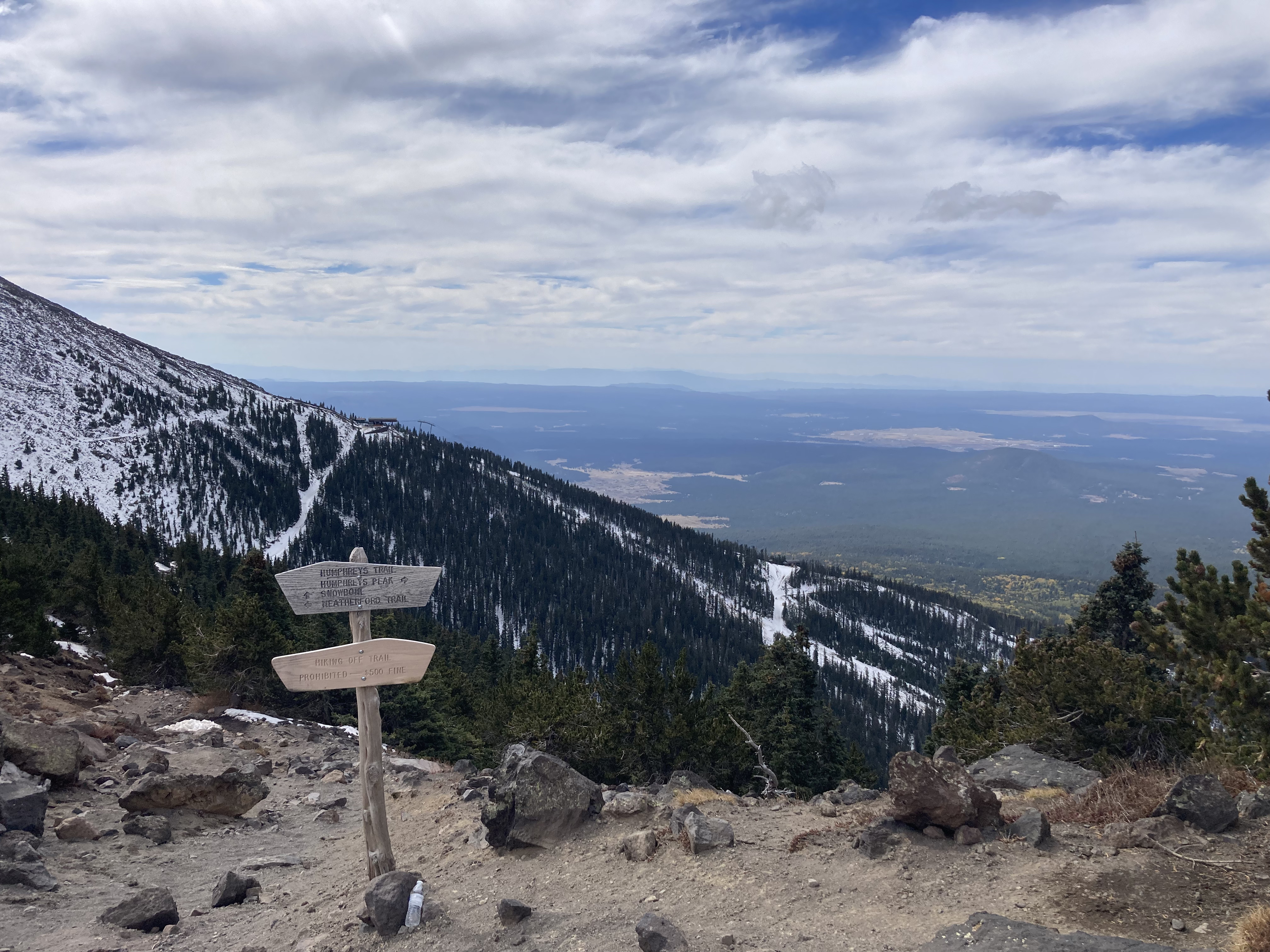 On October 17, my friend Crystal and I successfully summited Humphreys Peak. We do this hike each year, usually in the summer. However, this summer, we could not do the hike because of all the forest fire closures in and around Flagstaff. We were a little bummed to miss out on our annual “do or die” tradition, so when the forest fire closures lifted, we decided to pick a fall date and go for it. [Note: by “do or die,” I mean that we pick a date and hike Humphreys without training for it. We drive up, hike, and drive back in one day.] Our “do or die” approach is not something I recommend because the hike is a pretty strenuous one. Humphreys Peak is the highest point in Arizona, sitting at 12,633 ft (3,851 m), so altitude sickness is a real concern. According to my Garmin (cycling computer that tracks distance, elevation, and other workout statistics), the hike is a total of 10.2 miles round trip. Elevation gain is around 3,500 ft (1,067 m).