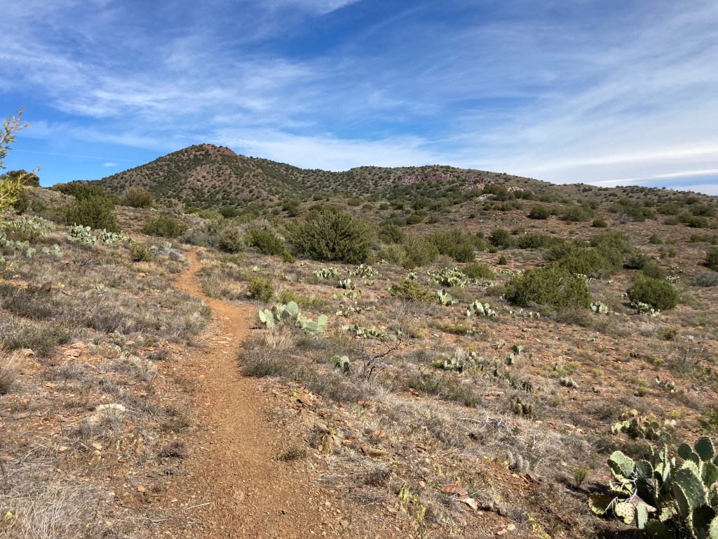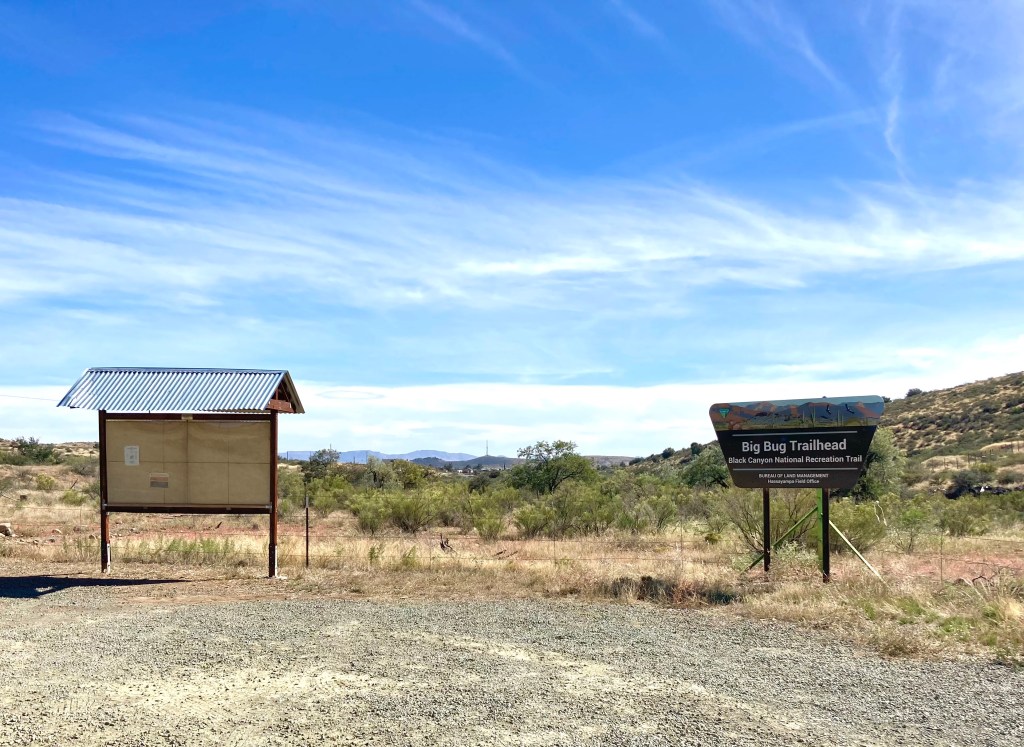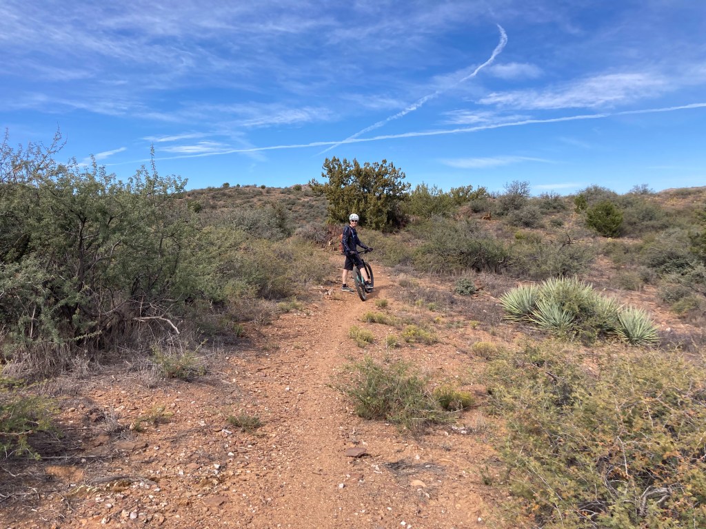 Last weekend, my SAT and I rode part of the Black Canyon Trail (BCT). The BCT is about 80 miles long and roughly parallels the I-17 in Arizona. It’s surprising that so many people who drive the I-17 to and from Phoenix have no idea that there’s an amazing trail just beside and below them. Most mountain bikers who ride the BCT select a specific section or two, rather than ride the entire trail. We chose to ride the Copper Mountain loop, which is a 15 mile loop that is SE of Prescott. The loop starts at the Big Bug trailhead (note: I think the reason the trailhead is called “Big Bug” is because of all the HUGE grasshoppers (or whatever they are) in the area). I was pretty impressed by the beauty of the area: lots of green due to all the rain we’ve received this monsoon season, red dirt, lots of prickly pear cacti and purple rocks. The loop itself is probably an intermediate-level trail; it isn’t extremely technical overall, but there are definitely sections that feature rock gardens (i.e., bunches of rocks clustered together) and some exposure.