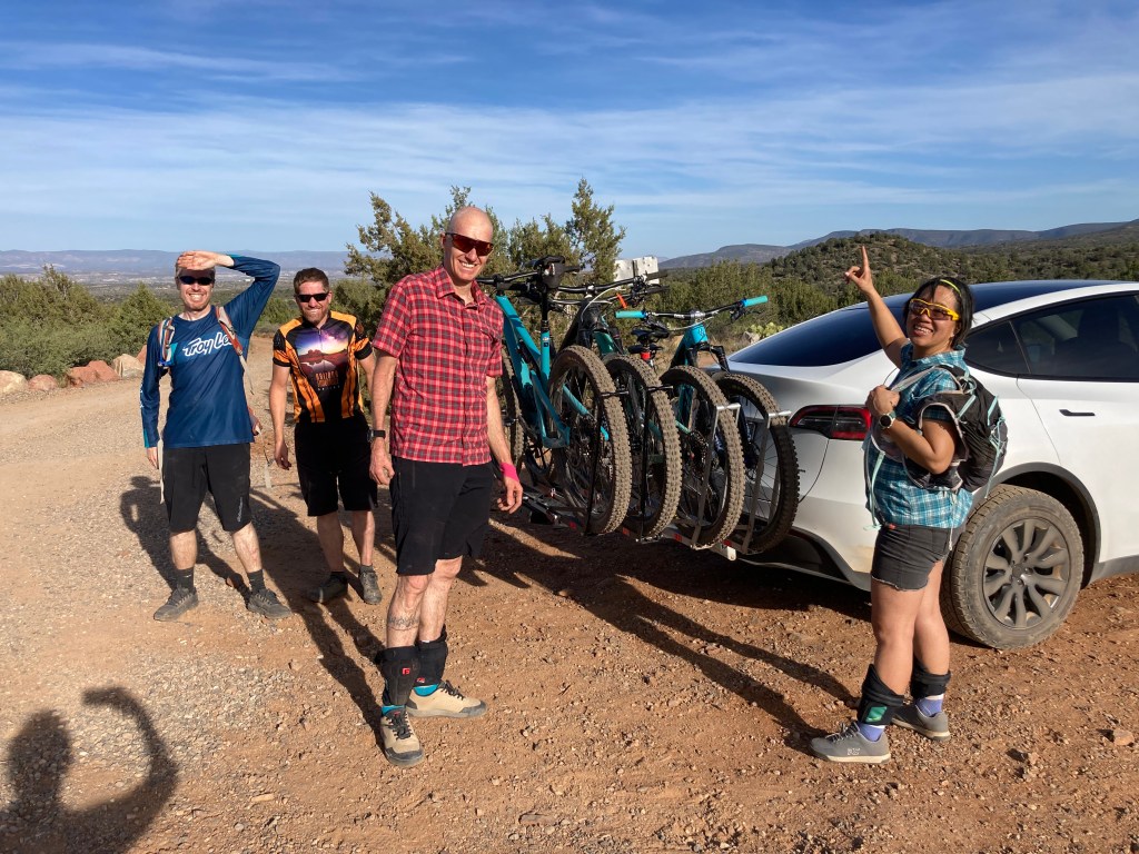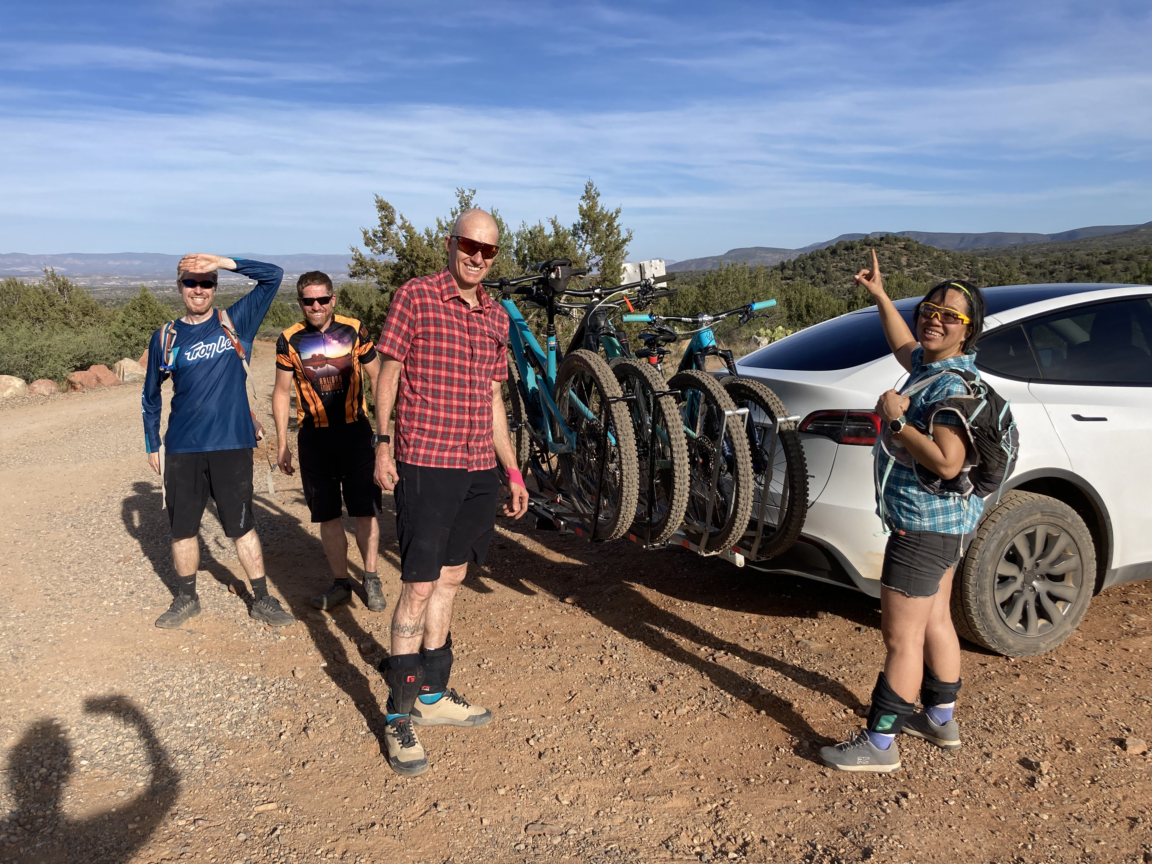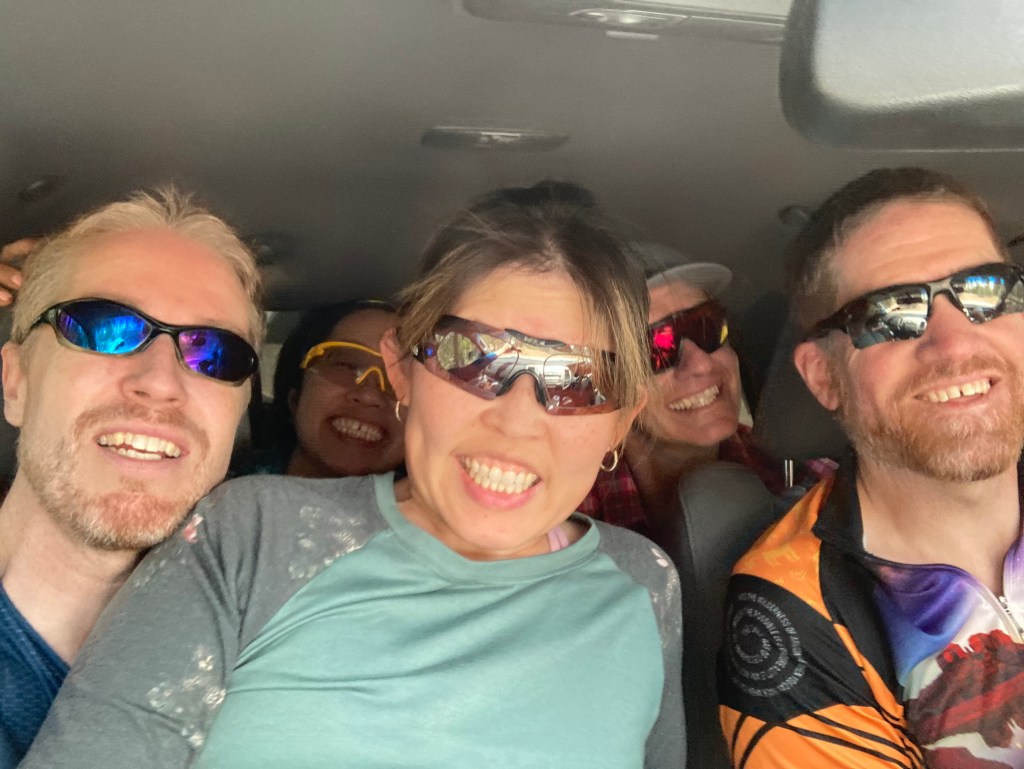 All 5 of us in the truck cab. Ian is driving and I’m sitting on my SAT’s lap.Took a wrong turn at the start of the ride and ended up at the lookout point.Too bad the wrong turn meant we climbed for nothing.Views were pretty nice!Top of the HAB section. Happy to be done the HAB section.More smiles, now that we reached the easier part of the ride!So. Much. Green.We survived! Check out the Tesla and the 4-bike rack! (My bike is INSIDE the Tesla, because it’s the smallest bike.)