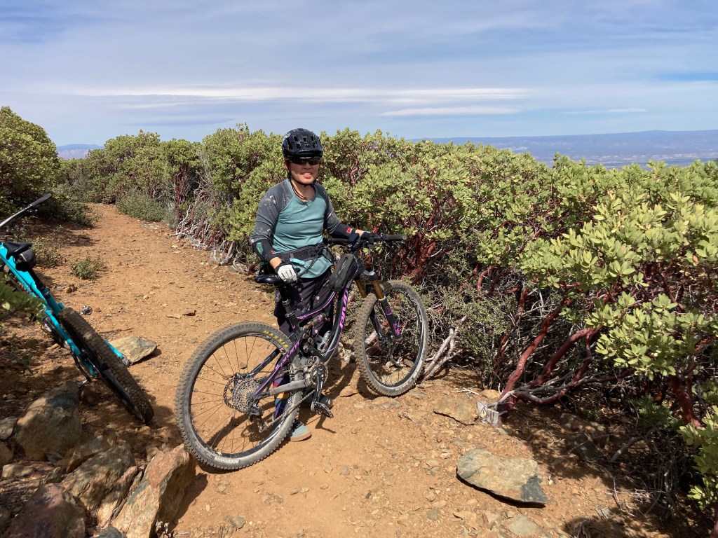 Carl and Lifan arrived mid-morning with their lovable doggies, Millie and Nala. After they settled in, we all packed into the truck (yes, all 5 of us in the cab!) and drove to the trailhead. We started with trail #9037, followed by the Black Canyon trail #114, then ended with the Gaddes #110 downhill. I think the word of the day was “adventurous,” because most of us found the first half of the ride to be fairly challenging. Why? Because the trail: