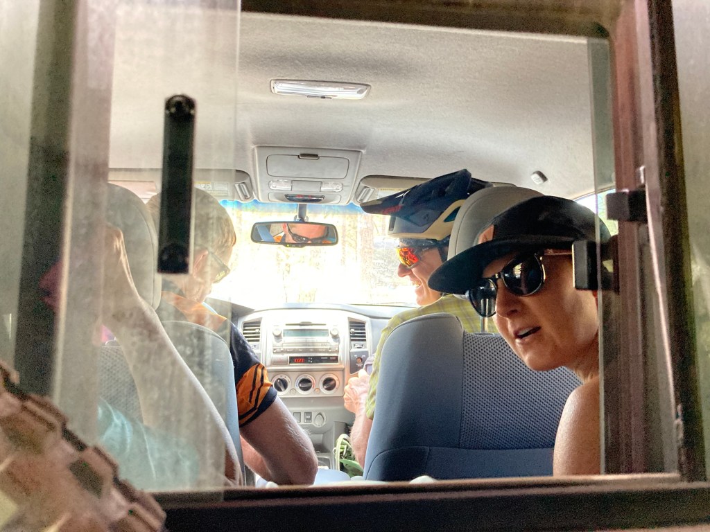 We all enjoyed another leisurely morning on Sunday, with lots of oatmeal, coffee, fruit, and conversation. Our friend (and Ian’s GF gf, i.e., gluten-free girlfriend) Vanessa arrived. Because none of us were looking for another strenuous ride (apologies to my SAT, haha), we decided to do a couple more moderate downhill trails (specifically, trail #533 and a couple of connector trails). We did have to do a shuttle, but this time, it was much less involved. This time, all 6 of us were in the truck: 4 people in the cab and 2 people, plus 2 bikes, in the back of the truck. The rest of the bikes were on the bike rack. My SAT and I elected to “take one for the team” by riding in the back of the truck. It wasn’t too uncomfortable, mainly because the drive was short and the 2 borrowed pillows from Carl and Lifan helped to cushion our aging knees. 🙂 The mountain biking this day was really fun, with enough flow and technical sections to provide (appropriate) challenge and lots of smiles. 10/10, I totally recommend.