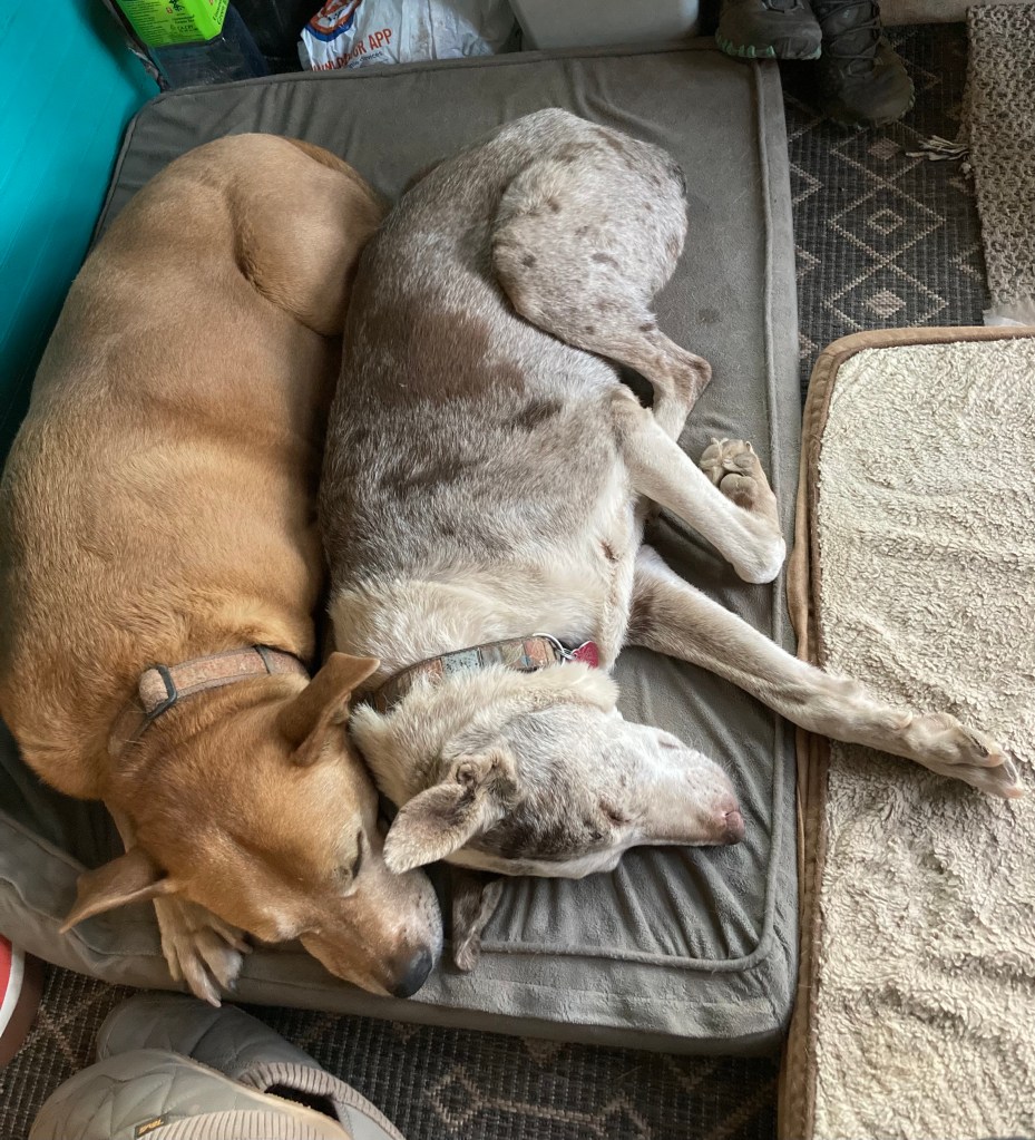 Our solar shower. Fill the black bag with water, let bag lie in the sun for several hours, hang from tree, and voilå! Nala, left, and Millie. Two tired doggies cuddling in the van.